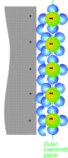The diffusion-limited current is concentration dependent and so can be used, as above, as an analytical probe to determine the concentration of an unknown copper solution.  To ensure the concentration dependence of the limiting current, we have to ensure that the Cu2+ ions move by diffusion (under the influence of a concentration gradient) and not by convection (stirring) or migration (under the influence of an electric field).  Since we are applying a potential across the electrodes, the ions will move by migration – a positively charged ion will be attracted to a negatively charged electrode.  To minimise the migration of the electroactive species, we add a large excess of electroinactive supporting electrode to the solution.  The electroinactive ions move by migration, but the electroactive Cu2+  ions move predominantly by diffusion so the Faradaic current is proportional to concentration.