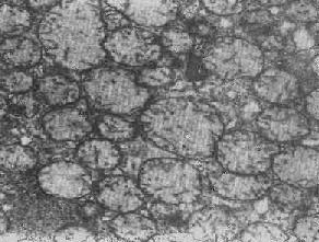 图1-11 线粒体肿胀(基质型)空泡变(心肌缺氧) 3.结构的改变 线粒体嵴是能量代谢的明显指征,但嵴的增多未必均伴有呼吸链酶的增加。嵴的膜和酶平行增多反映细胞的功能负荷加重,为一种适应状态的表现;反之,如嵴的膜和酶的增多不相平行,则是胞浆适应功能障碍的表现,此时细胞功能并不升高。 在急性细胞损伤时(大多为中毒或缺氧),线粒体的嵴被破坏;慢性亚致死性细胞损伤或营养缺乏时,线粒体的蛋白合成受障,以致线粒体几乎不再能形成新的嵴。 根据细胞损伤的种类和性质,可在线粒体基质或嵴内形成病理性包含物。这些包含物有的呈晶形或副晶形(可能由蛋白构成),如在线粒体性肌病或进行性肌营养不良时所见(图1-12);有的呈无定形的电子致