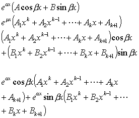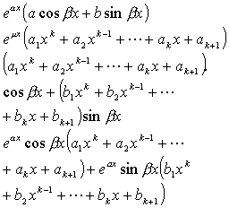 表中右栏表达式分别是(自上而下)在不是其特征根的情形下的特解的待定表达式;如果它们是特征方程的重根,那末在表中的表达式上再乘以.