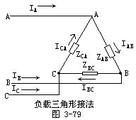 通常电源的线电压是对称的,不会因负载是否对称而改变,所以三角形连接时,负载不论对称与否,其相电压总是对称的。然而,负载的相电流与线电流却不相等。各负载中相电流的正方向分别规定从A到B、从B到C、从C到A。线电流的正方向仍规定从电源到负载。如图3-79中箭头所示。各负载中相电流的计算方法与单相电路完全相同。如果负载是对称的,则各相电流大小相等,即