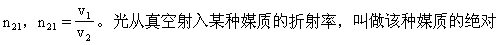 【折射率】 表示在两种(各向同性)媒质中光速比值的物理量。光从第一媒质进入第二媒质时(除垂直入射外),任一入射角的正弦和折射角的正弦之比对于折射率一定的两种媒质是一个常数。这常数称为“第二媒质对第一媒质的相对折射率”。(n12),并等于第一媒质中的
