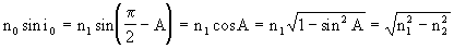 【光导纤维】 光导纤维是利用全反射规律而使光沿着弯曲途径传播的光学元件。它是由非常细的玻璃纤维组成束,每束约有几万根,其中每根通常都是一种带套层的圆柱形透明细丝,直径约为5~10微米,可用玻璃、石英、塑料等材料在高温下控制而成。它已被广泛地应用于光学窥视(传光、传像)和光通讯。光导纤维的结构如图4-6所示,内层材料选取的折射率大,外层材料的折射率低,就是要在内外层之间的界面上产生全反射,以保证光的传输效率。如图4-7所示,单箭头线表示临界光线,它在内外层分界面上的入射角等于或小于临界角A。若在折射率为n0的媒质中入射角大于i0的那些光线(以双箭头表示),在n1、n2分界面上的入射角就小于A,这些光线无法通过纤维而在其中传播。只有在媒质n0中其顶角为2i0的锥体内的全部光线才能在光学纤维中传播,根据临界角的定义。