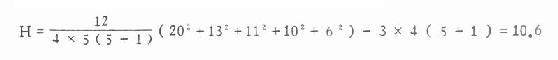 此处t>4,故查ν=5-1=4时的χ2值表,得:χ20.05,4=9.49,χ20.01,4=13.28,今χ20.05,4<H<X20.01,4,故0.05>P>0.01,在α=0.05水准上拒绝H0,接受H1差别显著;即五名受试者脉搏数相差显著,1号受试者最高,5号受试者最低。