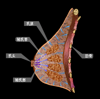 乳房主要由腺体、导管、脂肪组织和纤维组织等构成。其内部结构有如一棵倒着生长的小树。 乳房腺体由15~20个腺叶组成,每一腺叶分成若干个腺小叶,每一腺小叶又由10~100 个腺泡组成。这些腺泡紧密地排列在小乳管周围,腺泡的开口与小乳管相连。多个小乳管汇集成小叶间乳管,多个小叶间乳管再进一步汇集成一根整个腺叶的乳腺导管,又名输乳管。输乳管共15~20根,以乳头为中心呈放射状排列,汇集于乳晕,开口于乳头,称为输乳孔。