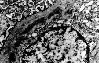图12-15 膜性增生性肾小球肾炎 Ⅰ型 肾小球毛细血管基底膜内侧,内皮细胞下电子致密沉积物,部分上皮细胞足突消失 Ⅱ型肾小球毛细血管基底膜不规则增厚。在基底膜致密层内有高电子密度的粗大呈带状的沉积物(图12-16)。故这型肾炎又称为致密沉积物性肾小球肾炎或致密沉积物病。