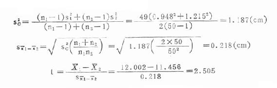 (二)t检验 可用于两样本含量n1、n2较小时,且要求两总体方差相等,即方差齐(homoscedasticity)。若被检验的两样本方差相差较大且差别有统计学意义则需用t'检验。