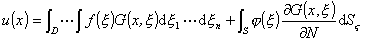 1°  一般公式  在区域D上应用格林公式(本节,四),并取v=G(x,),则方程Lu=f的狄利克莱问题u|s=的解为
