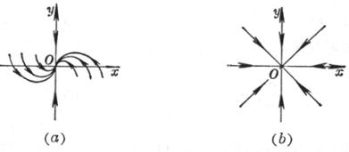 零解是渐近稳定的.轨道形状如图13.3(a).这种类型的平衡点(0,0)称为稳定的退化结点.